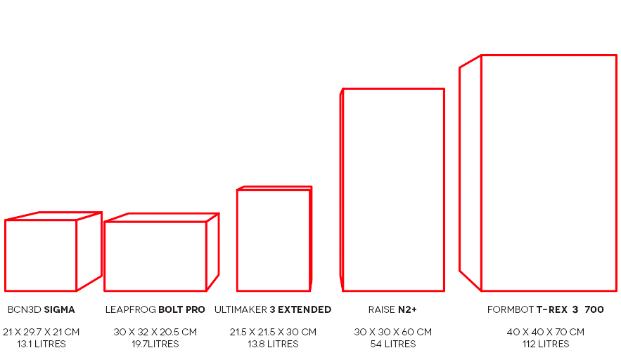 With 112,000 cubic centimetres of volume, the T-Rex 3 700 has twice the build volume of the Raise Pro 2 Plus for half the price, and and nearly three times the build volume of the Makerbot Replicator Z18! Never be constrained by your build volume again, and print big!