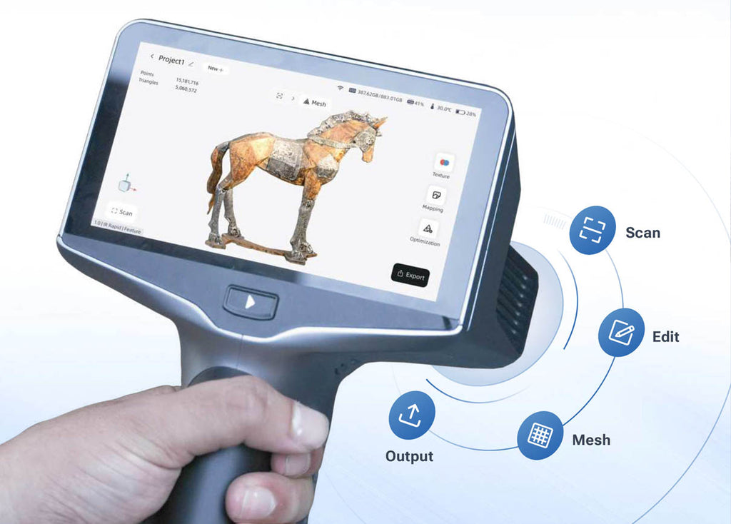 It is designed to accurately and efficiently scan medium to large-sized work pieces, providing a truly cable-free and computer-free 3D scanning experience, meeting high requirements for applications of digital archiving, reverse engineering, maintenance and repair in versatile industries like archaeology and heritage, CGI, forensic, architecture, manufacturing.