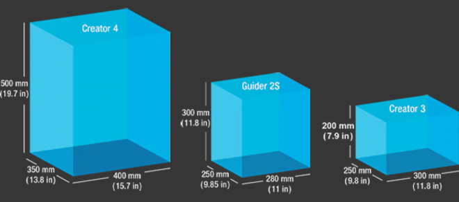 The Creator 4 is capable of printing 400 x 350 x 500mm
