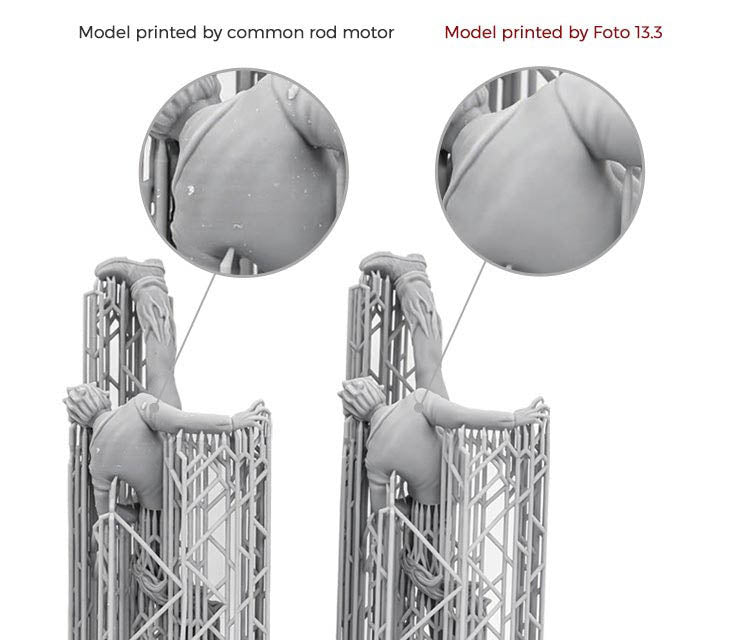 Different from normal lead screw rod that may cause clear print layers, Foto 13.3 is equipped with dual-linear ball screw rod, which ensures accurate and stable Z-axis moving, hence eliminating print layers and taking on precise details.
