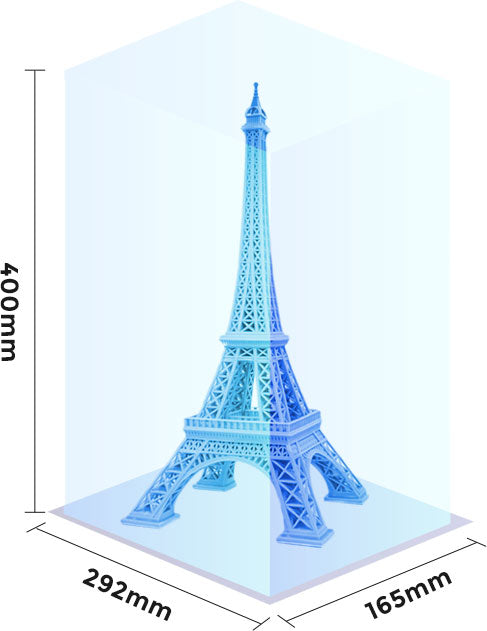 19L build volume: 292x165X400 mm. 4 times larger than that of other normal resin printers.