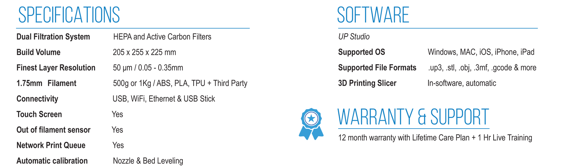 For ultimate in safety, the new UP300 has two filtration systems to ensure the absolute purity of airflow around the printer. A HEPA and activated carbon filter combined with higher airflow capacity allows the maintaining of minimal UFP and VOC density inside the printer's large enclosure.